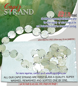 DESCRIPTION: 5 feet/150cm long, 38 Capiz chips with metal rings attached one after the other equally with extra 5 rings at the end. Packed individually in a transparent polybag. Available in any colors and shapes.